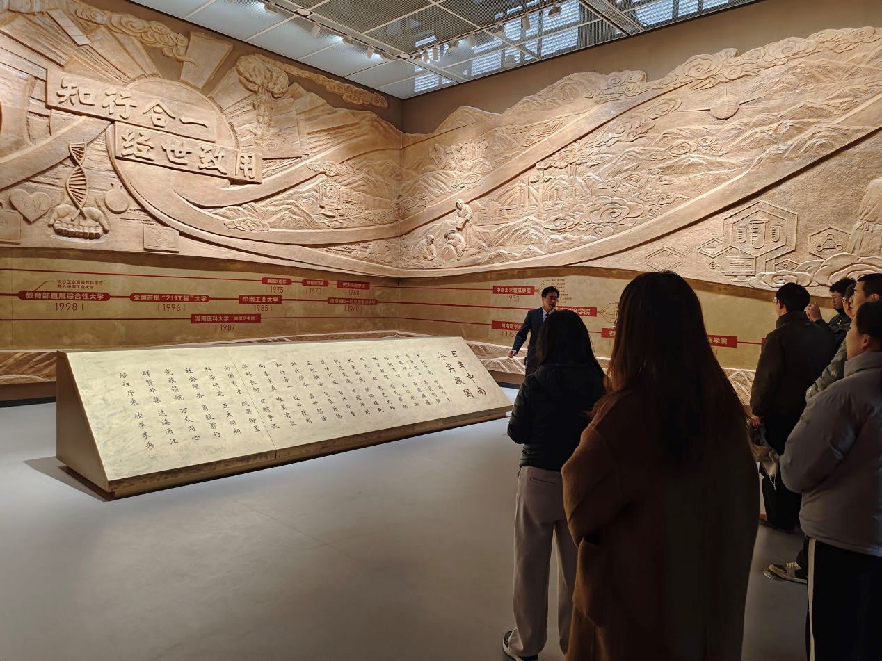 一进入校史馆,映入眼帘的是“知行合一,经世致用”的校训。在专业讲解员的引领下,首先来到介绍中南工业大学发展历程的第一单元。讲解员满怀自豪地提到,在短短1952 - 1959年这几年间,凭借雄厚的师资力量和严谨的治学态度,培养出了刘业翔、余永福等8名院士,为国家有色金属产业发展输送大量专业人才。接着步入展现湖南医科大学辉煌过往的第二单元。早在上世纪初,一批海外学成归来、满怀报国之志的医学先驱来到长沙,凭借自身精湛的医术和先进的理念,克服资金短缺、设备简陋、观念陈旧等诸多困难,建立起一套严谨、科学且极具前瞻性的医学教育体系。多年来,湘雅培养出大量优秀医学人才,“南湘雅,北协和” 的美名传遍大江南北,在中国医学发展历程中留下了浓墨重彩的一笔。离开湘雅板块,来到呈现长沙铁道博天堂娱乐城峥嵘岁月的第三单元。长沙铁道博天堂娱乐城自成立以来,始终与国家铁道事业发展紧密相连。从荒无人烟的山岭间进行铁路勘测设计,到面对复杂技术难题时的攻坚克难;从培养一批又一批专业扎实、吃苦耐劳的铁道技术人才,为我国铁路交通事业的蓬勃发展立下汗马功劳。