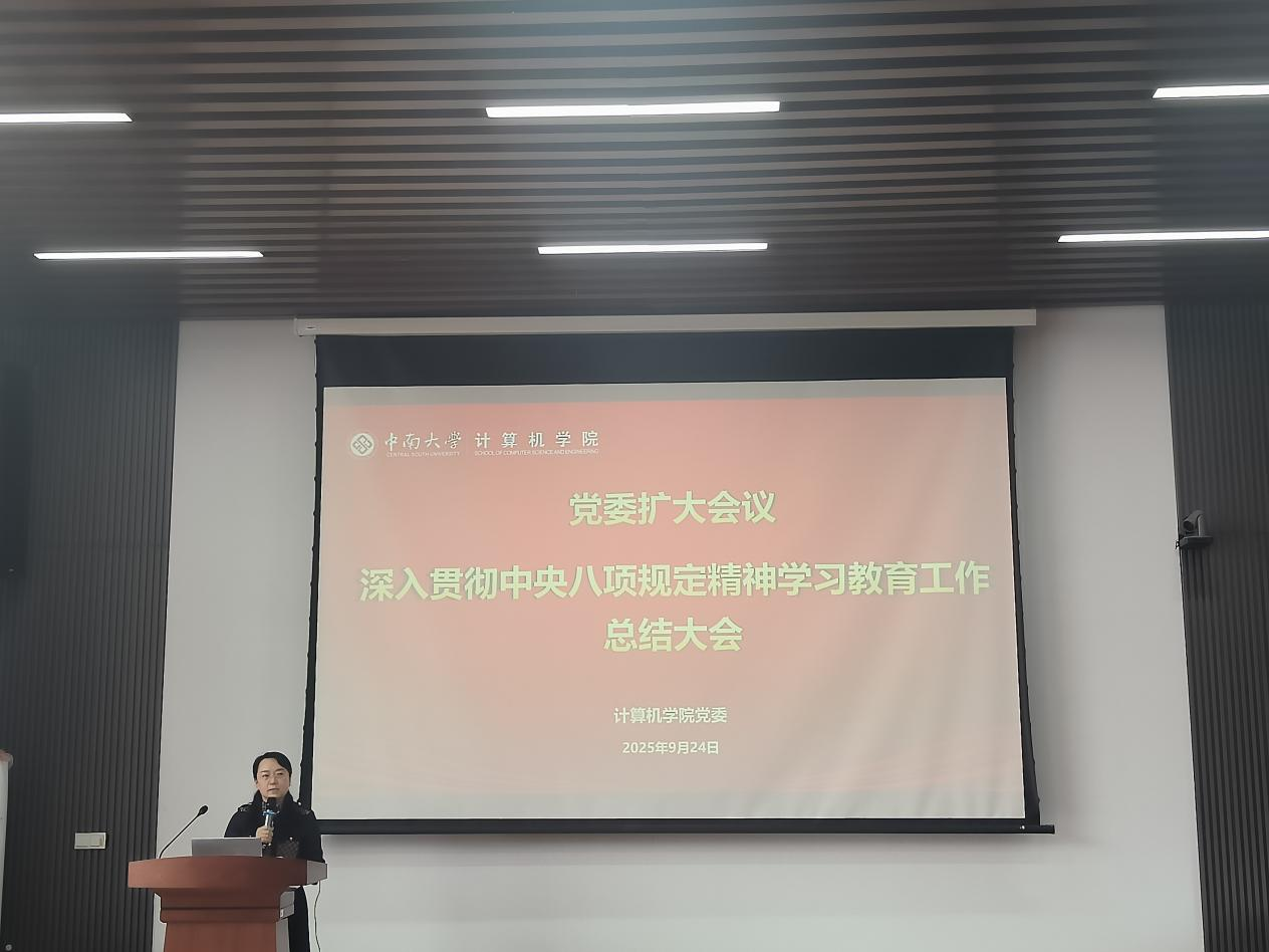 9月24日上午,计算机学院于信息楼535会议室召开深入贯彻中央八项规定精神学习教育总结会议传达学习习近平总书记关于深入贯彻中央八项规定精神学习教育的重要指示和有关会议精神全面总结学院学习教育开展情况部署下一步工作计划本次会议由学院党委书记赵晓霞主持,全体院领导班子成员各党支部书记参加
