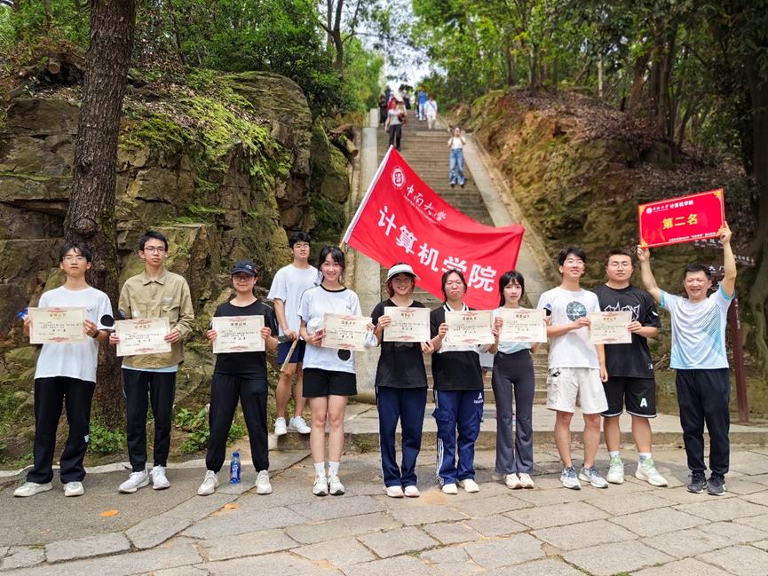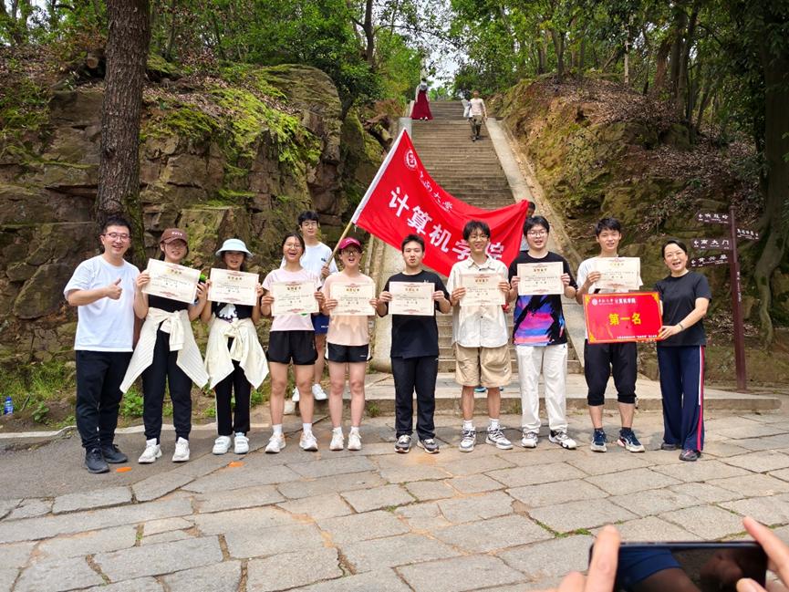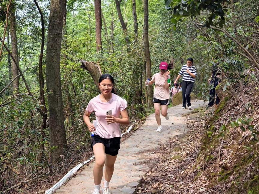登山之路,考验着选手们的体力与意志,亦考验着队员们的团结协作能力。好在,漫山葱荣之美景与同伴温暖之陪伴,让登顶之程充满欢乐。山路陡峭,队员们相互提醒;台阶易滑,同伴们彼此搀扶。师生之间相互鼓励,交流感受,共赏美景,其乐融融。