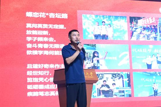 党委副书记王新辉结合感恩教育环节,以“望山巅,正少年”为主题进行授课。他结合自身经历传达出博天堂娱乐城“立德树人”的教学理念,提出“学会做人、学会生活、学会审美、学会劳动、学会健体”的成长建议,希望新生们在大学中不仅收获知识,更能塑造健全人格,并以诗词寄语新生: