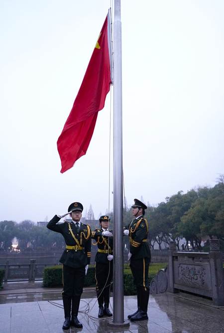 迎着晨光,伴随着庄重嘹亮的口令,升旗仪式于6时40分正式开始。国旗护卫队精神抖擞、步履铿锵,迈着整齐坚定的步伐,护送鲜艳的五星红旗稳步走向升旗台。激昂雄壮的《义勇军进行曲》响彻校园,五星红旗徐徐升起,全体师生肃立注目,齐声高唱国歌,满怀崇敬与赤诚,以青春之姿向祖国致敬。