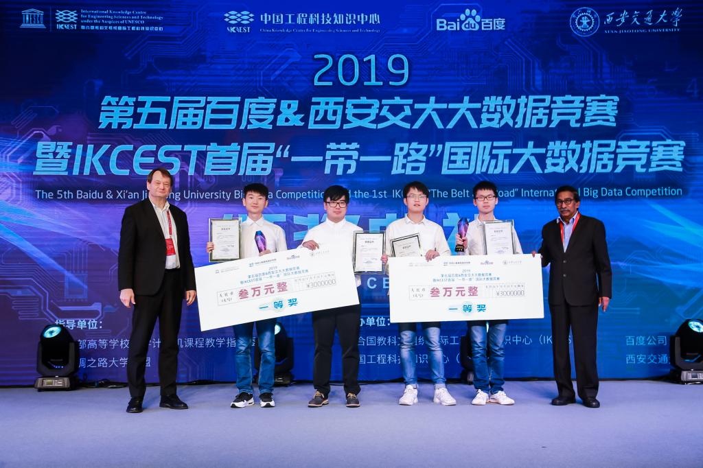颁奖典礼上,竞赛顾问委员会主席、中国工程院外籍院士、图灵奖得主Raj Reddy、中国工程院院士潘云鹤、印度科博天堂娱乐城院士N.Balakrishna、德国工程院院士Ottein Herzog、南非比勒陀利亚大学Jan Eloff和百度CTO王海峰博士等人为获奖选手颁奖并合影留念。本次获奖团队的五位同学均为18级硕士研究生,本次国际竞赛的获奖,体现了我院学子在大数据和人工智能方面扎实的学术功底和卓越的研发能力。