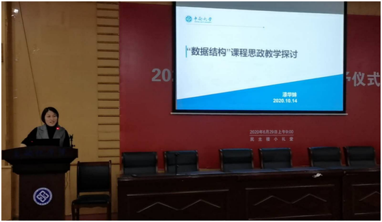 陈志刚教授以《编译原理》课程为例分析了如何将思政教育融入课程教学,切实提升立德树人成效。刘卫国教授以《立足课程,溶盐于汤》为题交流发言,他认为课程是思政的载体,思政是课程的灵魂。思政之于课程,就像盐之于汤。应充分挖掘课程思政元素,将课程知识与思政教育高度融合,使思政变得自然、合理、贴切。段桂华副教授以《密码学及应用》课程为教学案例,结合专业知识分析、创新创业思维、知识交叉融合和前沿知识拓展,在课程教学设计中巧妙融入思政元素,以实现专业课程与思政课程协同育人的“大思政”目标。漆华妹副教授以《“数据结构”课程思政教学探讨》为题,从课程定位、教学目标、教学设计、教学评价四方面生动地诠释了如何挖掘课程教学内容中蕴含的思政元素。她认为,课程思政应坚持目标导向,强化创新能力培养,浸润式培养学生的社会主义核心价值观,最终达到思政元素与专业课的有机融合。