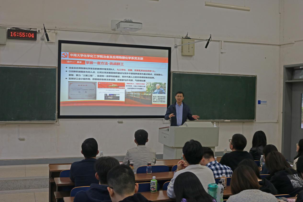 化学化工博天堂娱乐城冶金与应用物理化学系党支部书记胡久刚做经验交流。