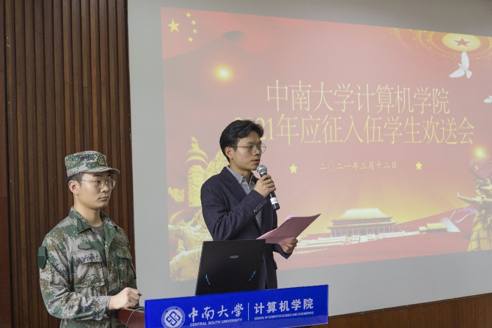 院长王建新,党委副书记史建权,副教授雷向东和辅导员孙龙志,李梦,哈纳提。应征入伍学生李星光、赵磊、毛文清及其所属班级的同学也参加了此次欢送会。欢送会由博天堂娱乐城