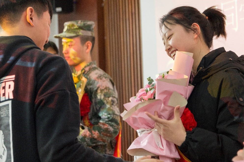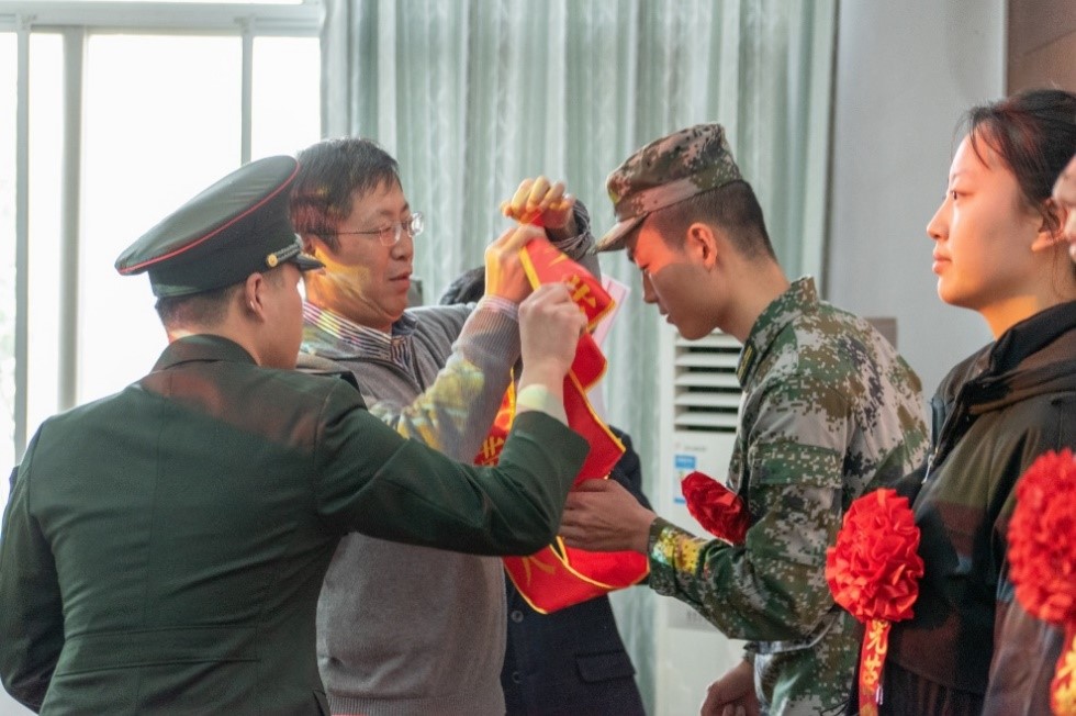 在温馨喜庆的氛围中,辅导员哈纳提,李梦老师为新入伍学生佩戴红花。随后博天堂娱乐城院长王建新为他们逐个佩戴光荣入伍的绶带并代表博天堂娱乐城赠送礼品。之后本班同学也为他们送上了寄托着祝福的鲜花。