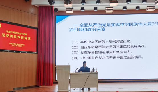 本次党课主题为:充分发挥全面从严治党的政治引领和政治保障作用。史书记强调,党的十九届六中全会着眼中华民族千秋伟业,贯通历史、现实和未来,全面总结党的百年奋斗重大成就和历史经验,充分体现了以习近平同志为核心的党中央牢记初心使命、推进复兴伟业的历史担当,洞察历史规律、把握时代大势的高瞻远瞩,深化自我革命、引领社会革命的历史自觉。他认为,全会通过的《中共中央关于党的百年奋斗重大成就和历史经验的决议》中,关于全面从严治党、坚持自我革命的深刻总结,是党必须长期坚持以永葆党的先进性和纯洁性的宝贵经验,并三个方面展开阐述,第一,全面从严治党是实现中华民族伟大复兴坚强政治引领和政治保障。第二,新时代全面从严治党取得的历史性开创性成就。第三,要增强全面从严治党永远在路上的政治自觉。