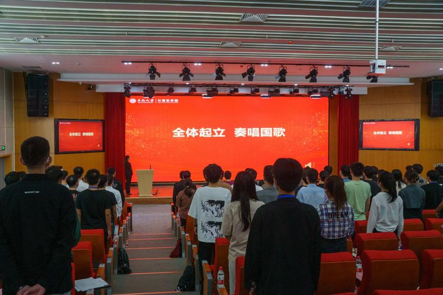 大会第一项,全体人员起立奏唱国歌。