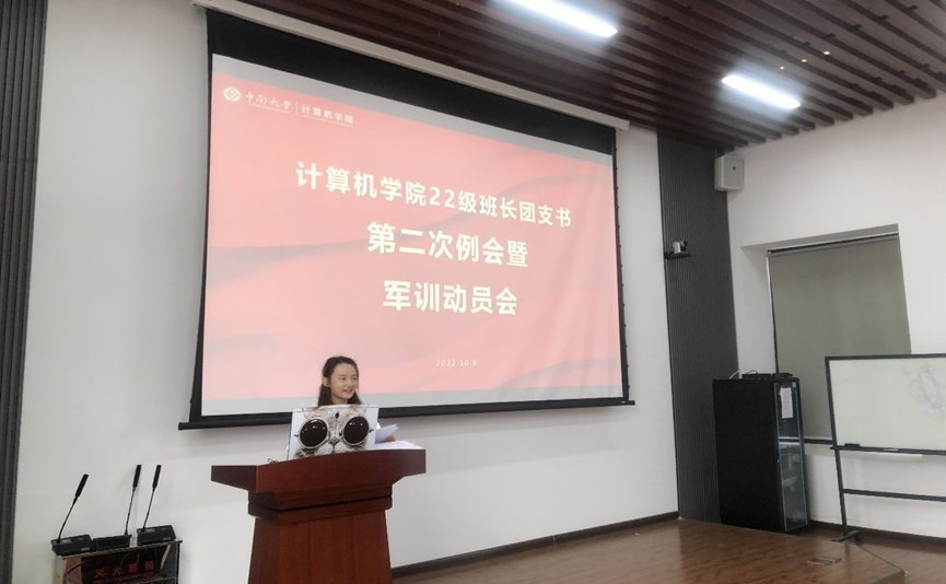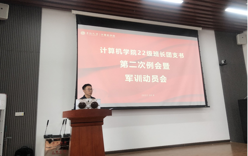信息楼535报告厅展开,军训指导员陈司宇、刘烁烁、何星霖三位老师,各连排军训教官以及22级全体班长、团支书出席了本次动员大会。