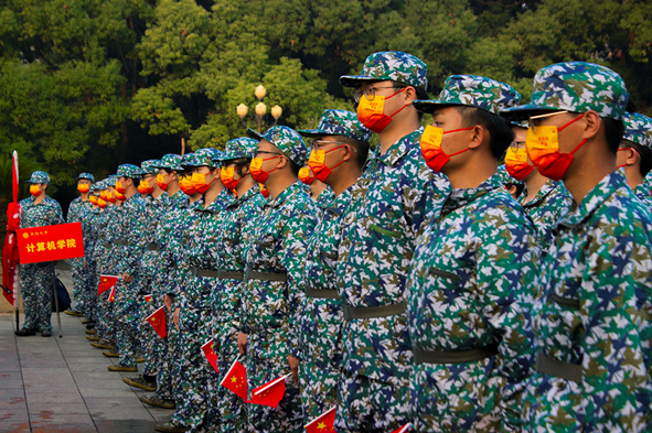 军训方阵依次唱响“没有共产党就没有新中国”,歌声此起彼伏,洪亮的歌声飘荡在体育场上空,激发了同学们的热情。