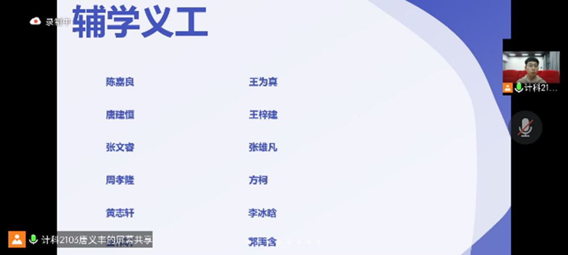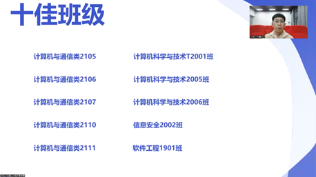 接下来,主持人周哲宇公布了2021-2022学年三十佳获奖名单,同时讲解了十佳团体、十佳班级、十佳个人的评比细则。十佳个人代表计科2005班的苗子阳同学从自身感触和对其他同学的学习建议两方面进行发言。