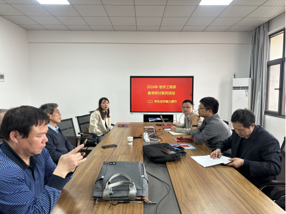 督导朱从旭老师、谭长庚老师,以及软件工程系全体老师汇聚一堂,针对老师教法、学生学法、学生动手能力提升等几个方面展开热烈讨论,一起研讨如何进一步完善软件工程系教学能力体系建设,系主任邝砾教授主持会议。