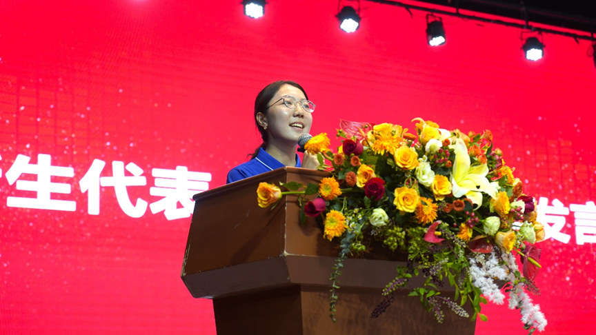 计算机科学与技术2107班张诗曼和计算机类2408班马艾琳则分别作为高年级代表和新生代表发言,与新生们分享了自己的成长经历与学习心得。张诗曼向新生们表示了热烈的欢迎和由衷的祝贺,希望学弟学妹们能够充分利用大学的资源和机遇,在丰富多彩的大学生活中全面提升自我,积极拥抱大学的无限可能,创造一段充实而难忘的大学时光。马艾琳表达了对未来四年大学的生活的无限憧憬,希望能够与同学们一同拥抱新环境,走出舒适圈,突破自我,不畏挫折,学以致用,在探索科学世界的旅途中为母校书写新华章,为党和国家做出自己的贡献。