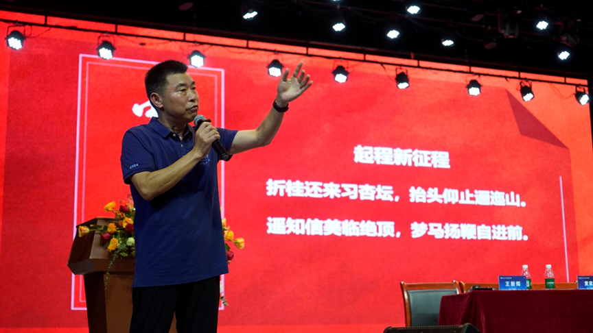 党委副书记王新辉以如何立德树人为主题向新生们开展了思想政治教育、道德品质教育与心理健康教育,传授了“六个学会”,即学会做人、学会生活、学会劳动、学会学习、学会审美、学会健体。王书记在最后送给新生们一首寄予厚望的绝句:折桂还来习杏坛,抬头仰止逦迤山。遥知信美临绝顶,梦马扬鞭自进前。