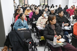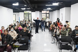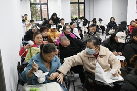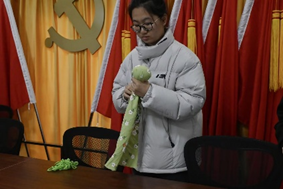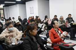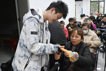 经过介绍,爷爷奶奶们已经对艾草锤的作用有了基本认识。志愿者们并没有将艾草锤成品直接交给爷爷奶奶们,而是送给了他们材料,由志愿者们进行教学。“自己动手,丰衣足食”的道理是老一辈最明白的道理,而他们的心灵手巧也着实让同学们大吃一惊——让同学们焦头烂额的艾草锤的制作,我们的“老朋友”们却做的又快又好。看到有困难的爷爷奶奶,不少志愿者们上前指导帮忙,爷爷奶奶们自己互相帮助,讲堂现场其乐融融。艾草锤制作完成后,同学们介绍其使用方法和功效,通过捶打身体穴位,如肩颈、腰背、腿部等,能让艾草的药效渗透肌肤,起到放松肌肉、缓解疲劳、促进局部血液循环的作用,帮助爷爷奶奶们缓解身体酸痛和不适。