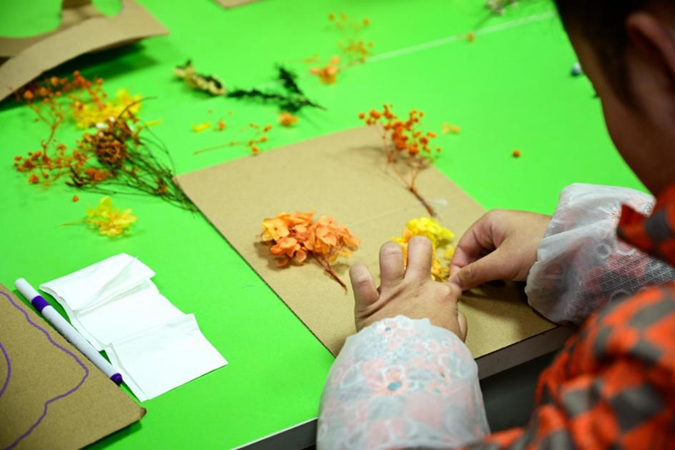 “自然画框”活动则为学员们提供了一个发挥创造力的舞台。他们在志愿者的协助下,巧妙运用胶水、干花、玻璃画框、马克笔等材料,将自然元素自由组合。其中李学员用马克笔画下了自己的一家人和小屋池塘这样一副温馨的场面,这些作品不仅让干枯的花草重焕生机,更展示了学员们丰富温暖的内心世界。