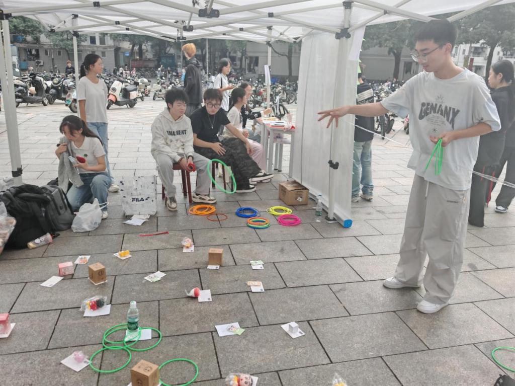 此外,活动还设置了趣味套圈游戏,同学们可以通过参与心情盲盒活动获得套圈机会,只要套中贴有“快乐”、“幸福”等不同词汇的目标,即可获得对应的小奖品。