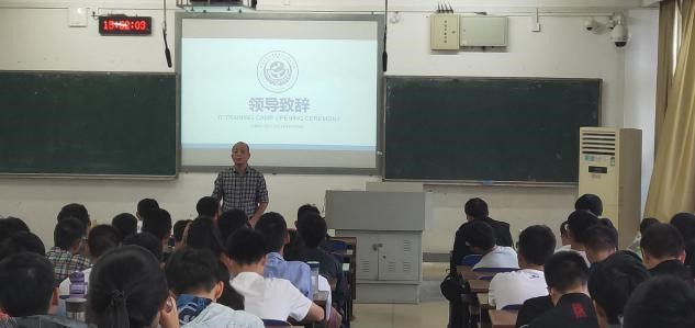 辅导员刘逸峰老师作为大会嘉宾。他们为开幕式发表了热情的致辞:向同学们表示亲切的问候,并提出对于IT训练营策划的宝贵意见、对同学们大学学习生活的建议与指导等。