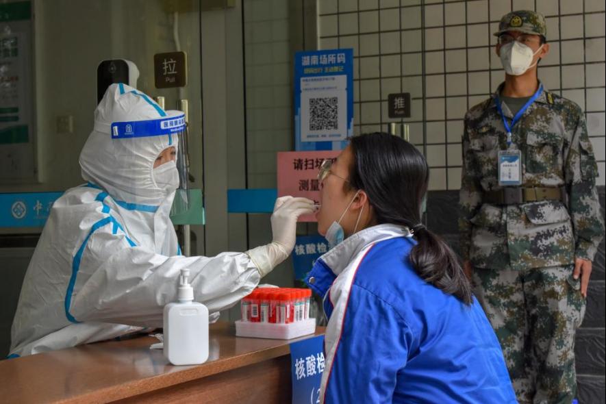 启动第五轮全员核酸检测。今日阴云密布,细雨连绵,但医护人员、党员突击队和大学生军官们风雨无阻,按时来到各个核酸检测点。一如既往地引导同学们按时检测核酸,并提醒同学们戴好口罩,有序排队,保持安全间距。