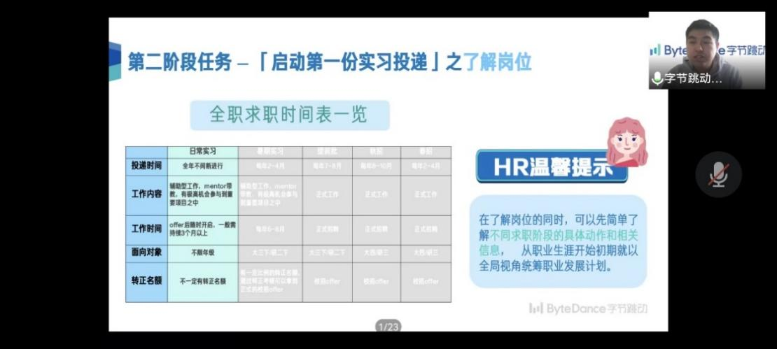 20级研究生辅导员刘逸峰老师主持,并邀请字节跳动资深HR王经理为同学们做出指导。