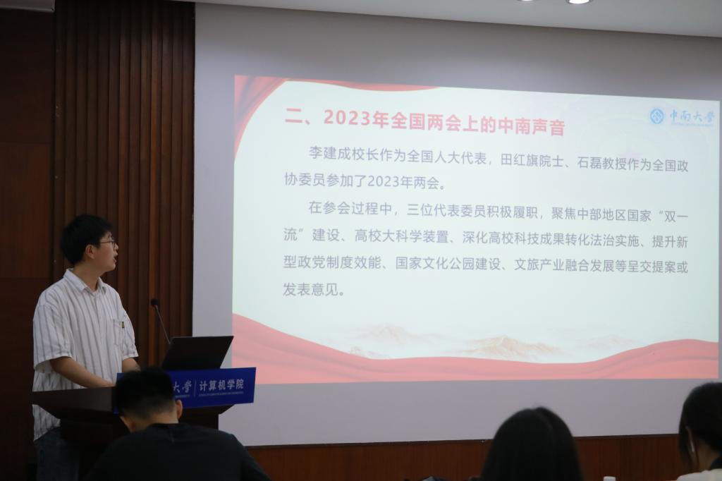 大会第二项,朱鹏阳同学作关于学习两会精神的研讨分享。朱鹏阳同学首先通过播放视频,让大家跟随习近平总书记的两会“微镜头”,重温两会盛况;再从两会的意义强调其重要性,并聚焦到此次两会现场出现的“中南声音”上,我校李建成校长作为全国人大代表,田红旗院士、石磊教授作为全国政协委员出席会议,在参会过程中,三位代表委员积极履职,呈交提案或发表意见;最后观看关于十年两会期间,习近平总书记与青年的交流实录,谨记习近平总书记对于青年的殷殷嘱托,奋发向上,努力拼搏。