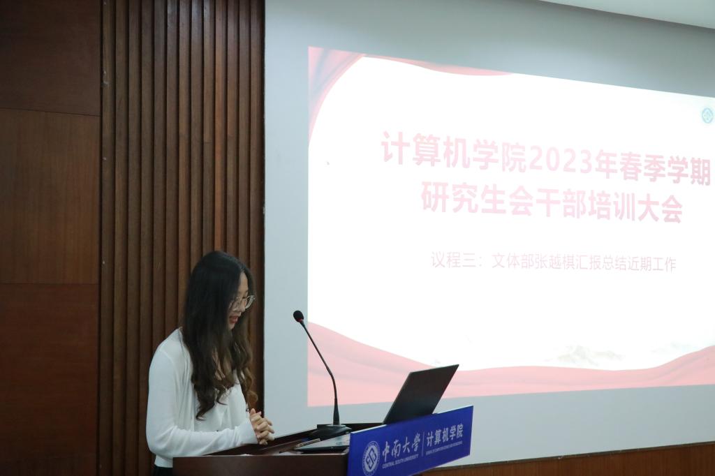 大会第三项,文体部张越棋同学对近期工作进行总结。张越棋同学表示研究生会同学们配合默契,环环相扣,吃苦耐劳,活动顺利开展,活动参与度高,各班级认真参与,在操场上各班团结一心,增加了各班级凝聚力。她也提到了工作流程中需要改进的地方,一是研究生会消息回复不及时,导致工作开展不够快,二是请假制度不够完善,并希望同学们在未来工作中继续努力。