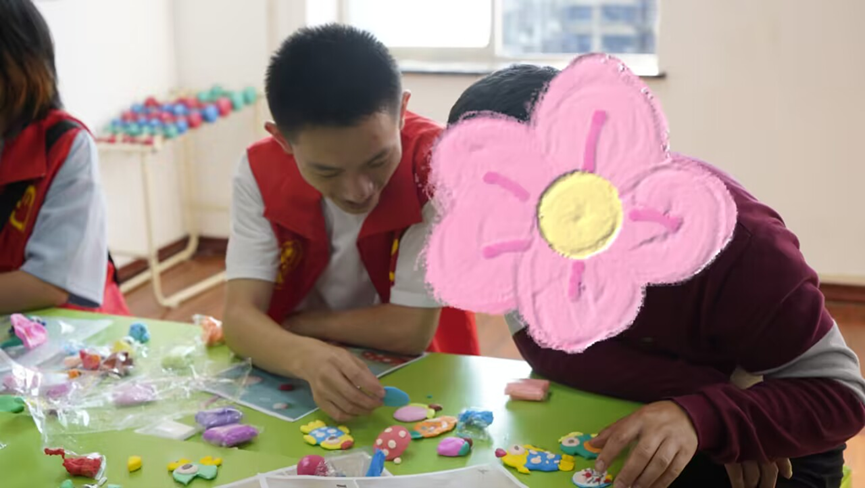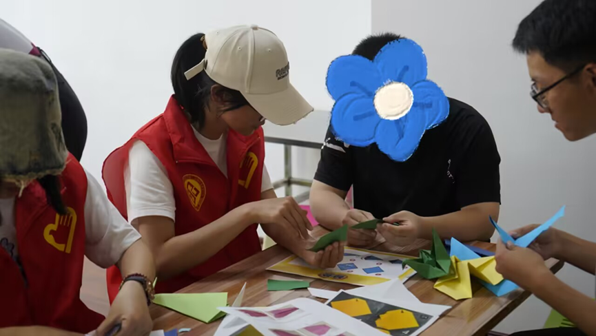 下午2时10分,志愿者开始组织游戏。学员们热情高涨,或专注于七巧板,或钟情于粘土制作,或认真学习折纸,收获了精美独特的作品。在这些环节中,学员们锻炼了动手能力和语言交流能力。志愿者还将准备好的水果分发给学员,活动室洋溢着欢声笑语。