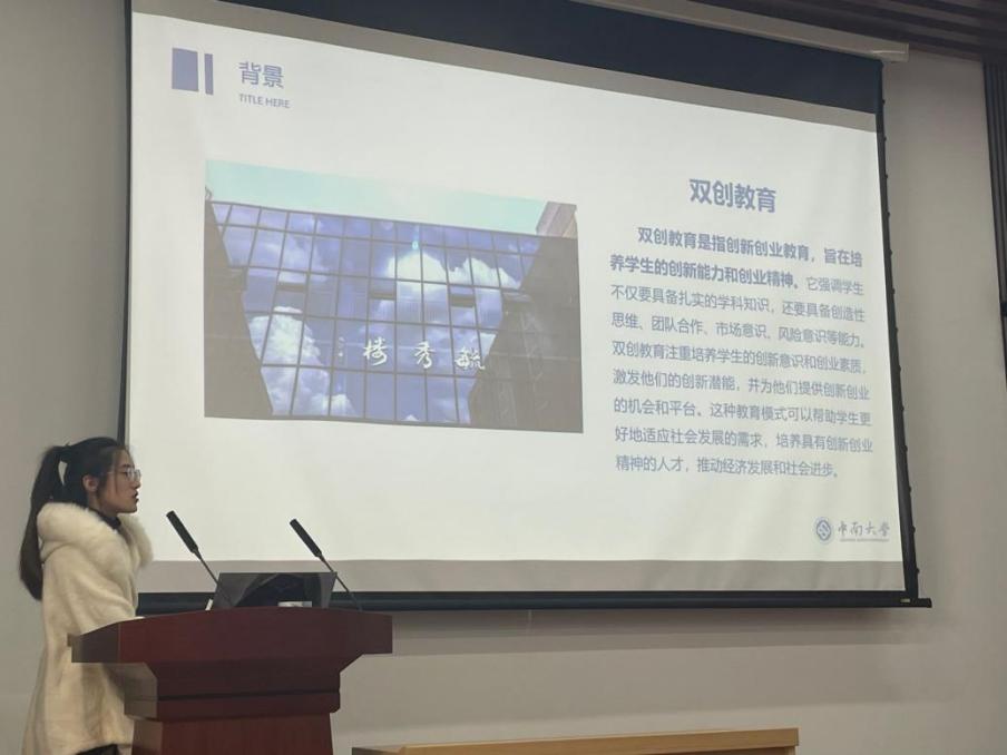 双创专干姜雨辰老师发言,她向同学们介绍了发展双创教育的目的,即培养创新能力,创业精神,团队合作能力,市场意识和危机意识。接着姜老师详细介绍了双创委员的职责和任务,展示了过往几年大创项目取得的优秀成果。她寄语同学们在创新创业的过程中,感悟研究和拓展的方法,在实践中学习,在实践中进步。双创委员发挥带头作用,让尽可能多的同学们参与双创活动,共筑创新创业实践活动的美好未来。