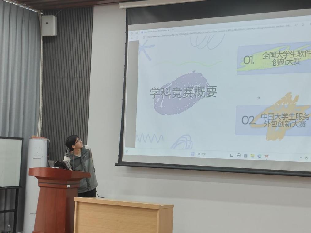 大会第二项,科协竞赛部副部长梁凉向同学们介绍了其他类型学科竞赛。他详细讲解了全国大学生软件创新大赛和中国大学生服务外包创新大赛的赛事流程及时间安排,方便各双创委员传达给各班的学生,除此之外,他也介绍了这些比赛的在综测和保研方面的加分政策,鼓励同学们积极参与,争取在比赛中获得优秀成绩,为未来铺路。