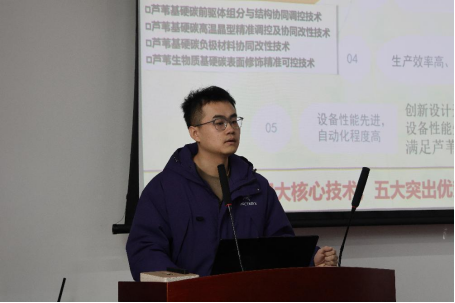第一支参赛队伍以“返芦归碳”为主题,采用低成本钠离子负极材料进行科技攻关,突破了传统材料的限制。生物质硬碳材料技术研发和改进,为环保材料的应用提供了新思路。路演中展示了实验数据和成果,展现了他们的研究成果和潜在市场前景。在路演结束后,教授们就企业结构和安全性进行提问,演讲人以实验数据和成果为依托,完整精确的回答了教授们的问题。