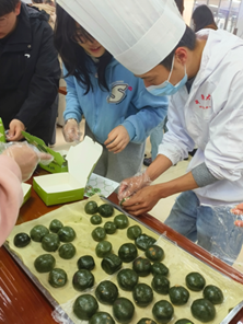 只此“清”绿共此时,制青团,承文化。青团代表着青年的活力,寄托着家乡的眷恋,蕴含着时代的哀思。研究生会的志愿者们准备了充足多样的青团制作材料,并邀请了一位经验丰富的厨师进行现场青团制作示范,详细展示了和面、馅料选择、包裹青团等关键步骤。很快同学们便掌握了制作青团的技巧,志愿者们协助他们分好小组,青团制作便正式开始了。在制作青团的过程中,同学们积极合作,分工明确,互相学习交流,场面温馨而热闹。通过亲手揉捏、包裹、蒸制,大家不仅体验了传统手工艺制作的乐趣,更感受到了传统文化的魅力。
