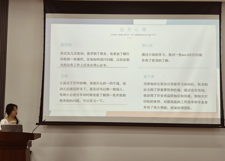 助理团队于5月12日在信息楼535会议室举办了技能培训展示比赛。此次比赛旨在为团队成员提供展示自身成长、分享小组学习成果的契机,以激发成员的工作积极性,促进团队向上发展。