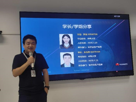 校友,2020年入职的罗晟学姐和2010年入职的朱光辉学长,分享了他们在华为工作的经历和心得体会。学长学姐分别从自身角度讲述了华为的工作环境、职业发展路径以及在华为成长的点滴经验,为在场学生提供了宝贵的职业规划建议。