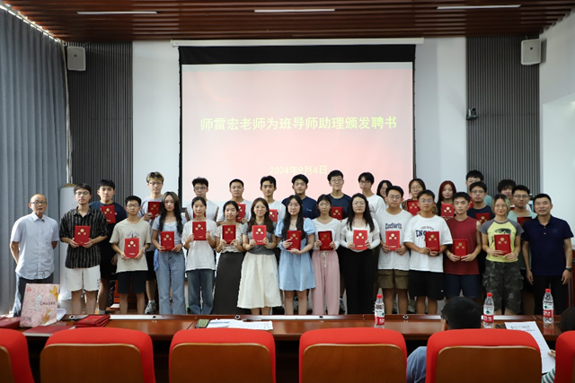 会议伊始,师雷宏宣读2024级本科生班导师及班导师助理聘任结果。王新辉为新任班导师颁发聘书,师雷宏为新任班导师助理颁发聘书。