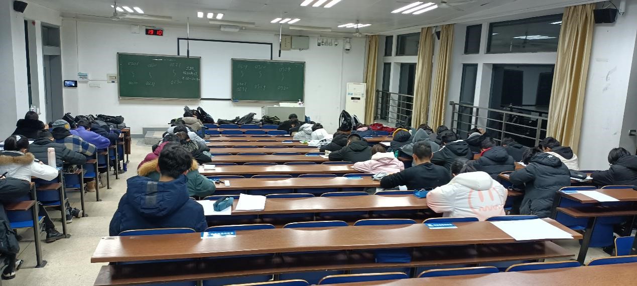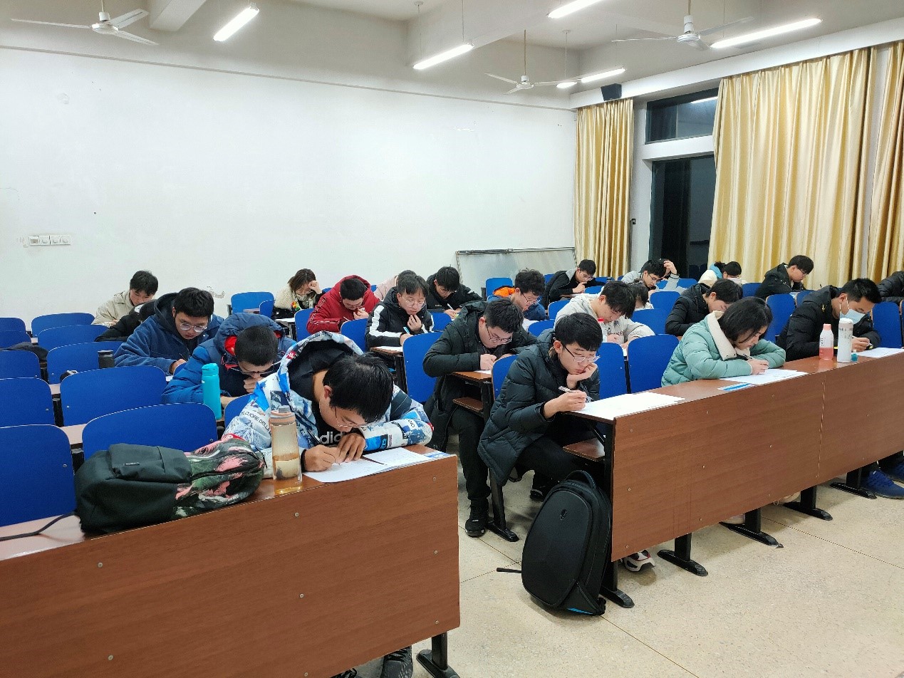 考前一小时,同学们就陆续来到考场,坐定并静候考试开始。晚上七点,考试正式开始,同学们开始紧张地答题。考试过程中,每一位同学均严守纪律,认真作答。