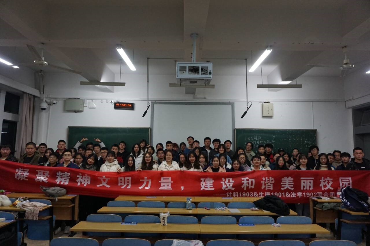 为了让同学们更加了解文明校园的意义,法学1902班、生医1901班、计科1903班三个团支部于12月23日在新校区B205教室集体举办这次团日活动,旨在鼓励同学们坚持文明行为,共建文明校园。计科1903班团支书潘新俞首先简要介绍了文明校园的目的与校园中不文明现象的情况。潘团支书指出,共创文明校园需要每一位同学的努力,同时也能让每位同学的生活更加愉快,创建文明校园是为了让同学们更高效的学习的一项重要举措,是同学们后勤的重要保障。