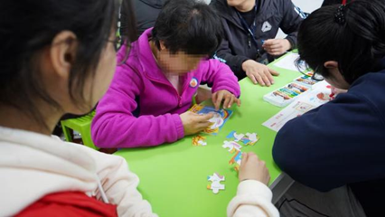下午3时,志愿者们带领小组成员开展游戏。游戏以简单的三阶拼图和给画填色为主。学员们积极配合参与游戏,热情高涨。有的学员专注于一幅接一幅地拼拼图,收获了极大的满足感。有的学员钟情于绘画涂色,用蜡笔细致地将图画的边框上色,在锻炼专注能力的同时也收获了色彩纷呈的画作。志愿者们又给慧灵学员们播放动物叫声让他们听音辨物,并借助动画帮他们了解各种动物。动物的叫声与学员们的笑声交织,萦绕在活动中心,呈现出一派祥和景象。游戏期间,学员们锻炼了感知能力、逻辑能力和语言交往能力,同时志愿者们也收获了一个绝好的契机来了解这群“折翼的天使”。