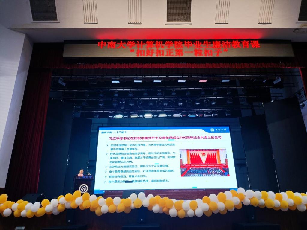 在学习贯彻习近平新时代中国特色社会主义思想主题教育开展之际,计算机开展“扣正扣好第一粒扣子”廉洁教育,希望毕业生们在勇立潮头面对大风大浪的挑战前,要树立正确的世界观、人生观、价值观,要胸怀大志,明大德、守公德、严私德,清清白白做人、干干净净做事,扣好扣正入职前的第一粒扣子。